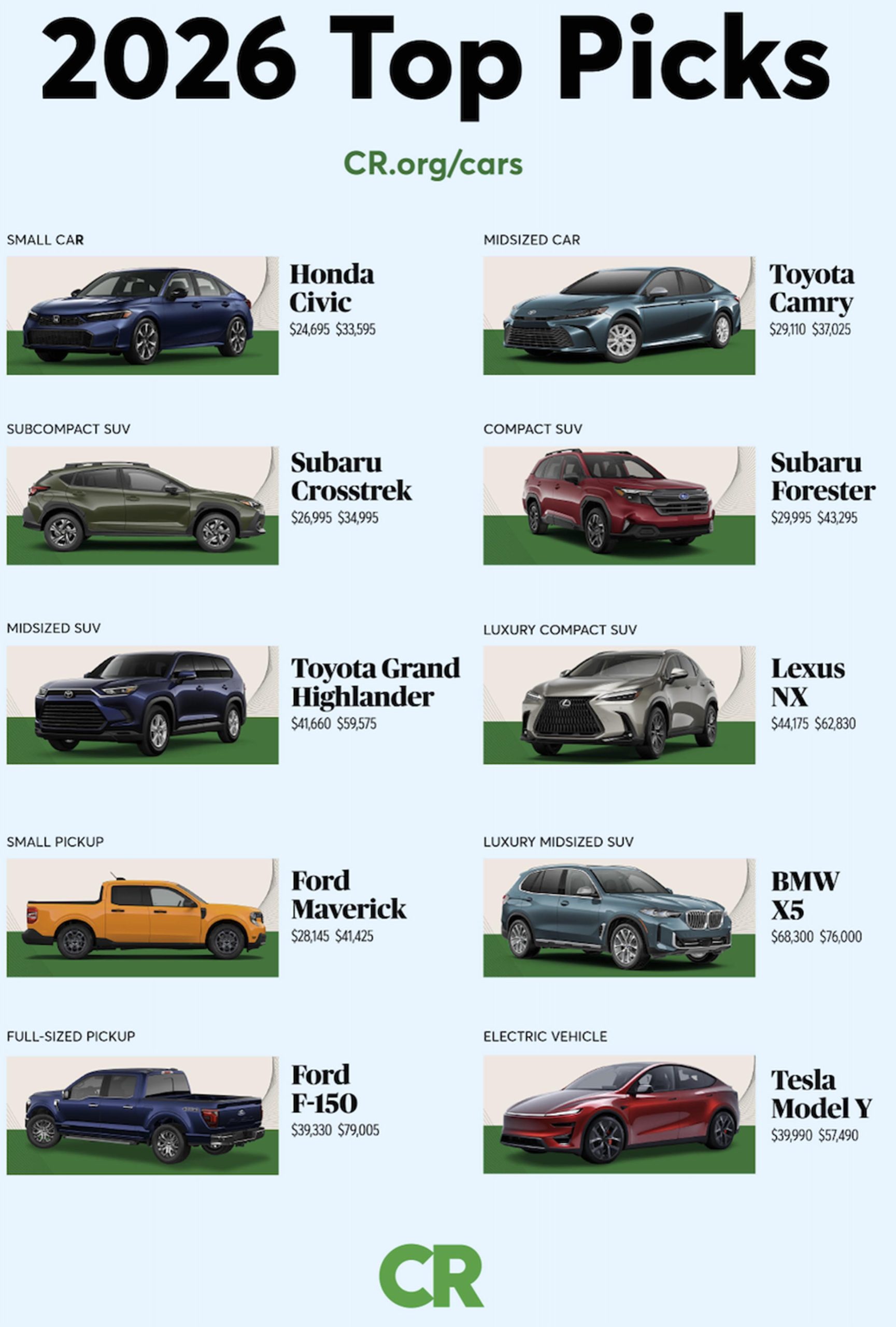 Of the 10 models chosen this year, three are new to the list: the Honda Civic, Toyota Grand Highlander, and Ford F-150. (Unfortunately for motorists interested in going all-electric, Ford is dropping the F-150 Lightning – but will continue to offer the PowerBoost hybrid package.) All seven other models carry over from the 2025 CR list.
