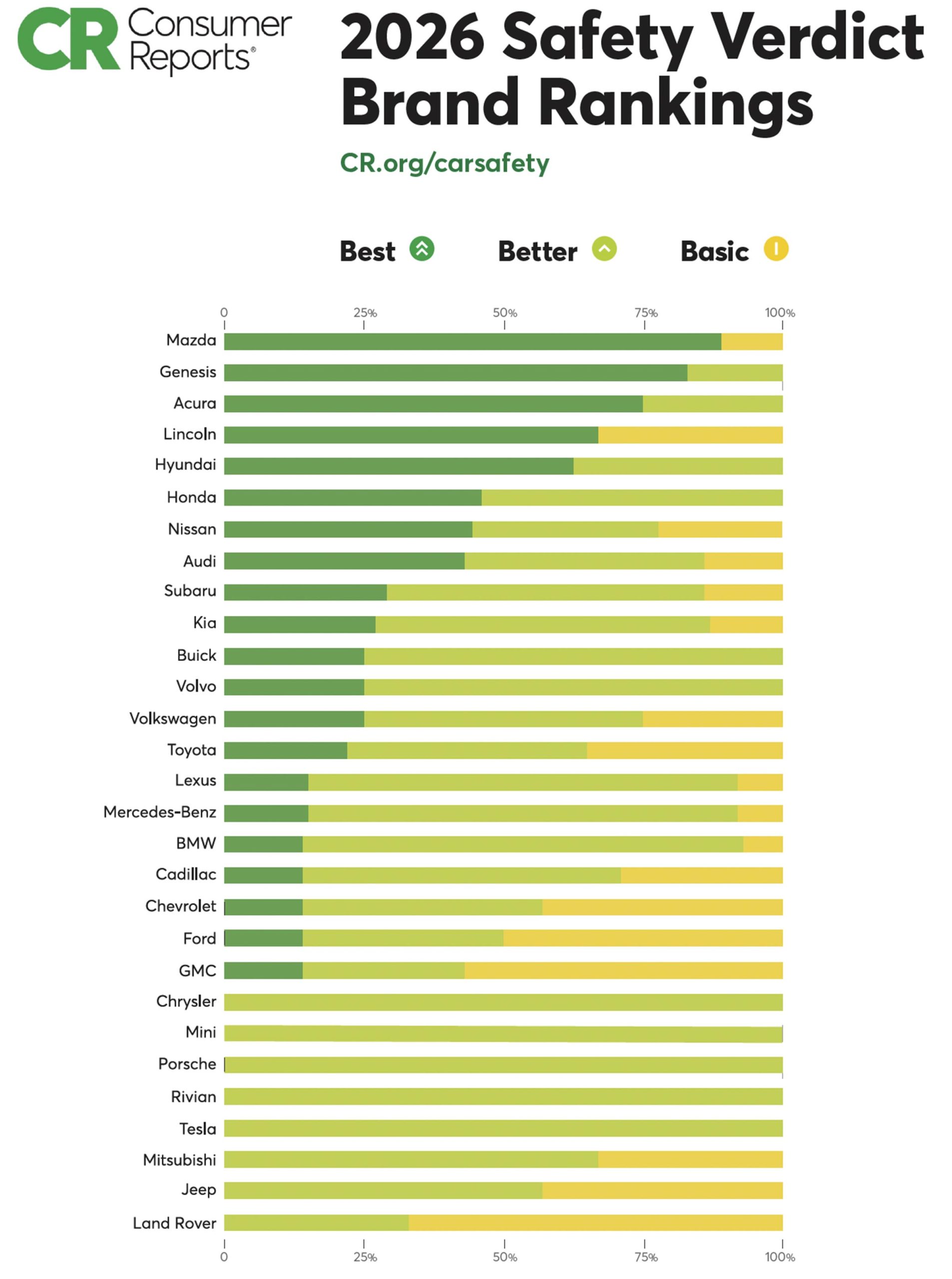 According to CR’s new Safety Verdict, Mazda ranked the highest, with more than half its products getting the top, “Best” score in a three-tier scale. It was followed, in order, by Genesis, Acura, Hyundai and Lincoln.