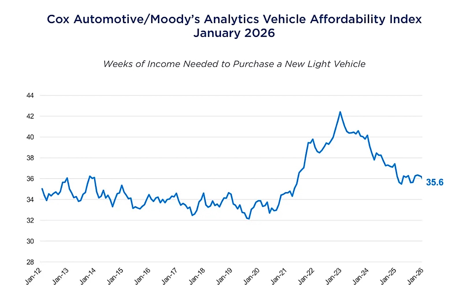 The number of median weeks of income needed to purchase the average new vehicle declined to 35.6 weeks from 36.2 weeks in December. The average monthly payment peaked at $795 in December 2022, Cox noted.