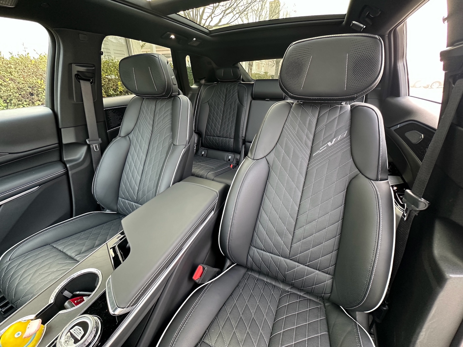 Upholstered in quilted Nappa leather, the seats are at once inviting and handsome. Enhancing the airiness of the cabin, the dual-panel sunroof renders the majority of the roof translucent. Head, shoulder, hip and legroom are good at all seating positions, and the flat floor makes ingress and egress easily accomplished.