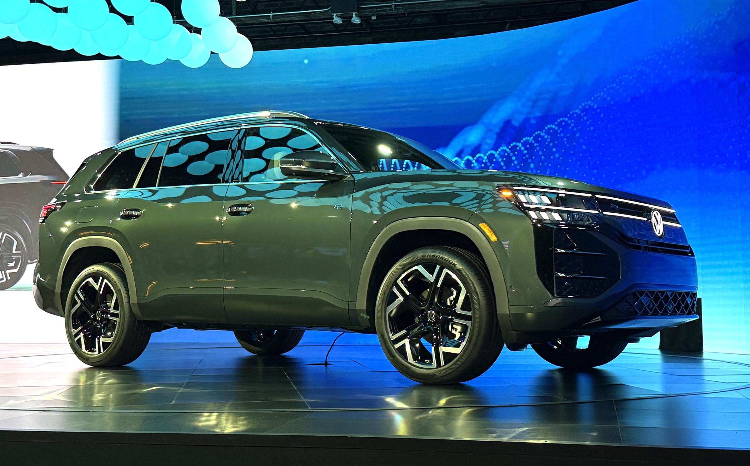 Even so, VW said all sheet metal but for the roof, have been revised. The SUV features double-stacked headlights and a new, illuminated VW badge on the grille. There’s a new spoiler and flush tailgate, as well as cross-body taillamps.